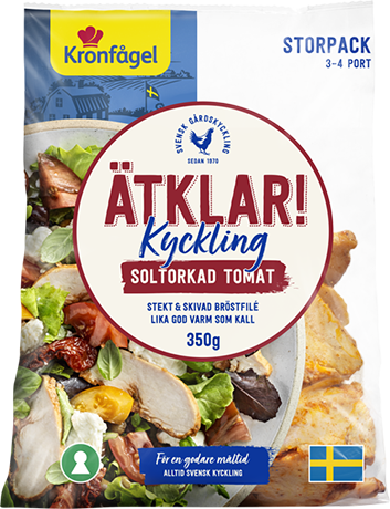Ätklar kyckling soltorkad tomat från Kronfågel är färdiglagade kycklingskivor perfekta för dig som inte vill välja mellan tid eller kvalitet. Kryddningen med smak av soltorkad tomat ger vår kyckling en rik och fyllig smak som lyfter din sallad, wrap eller pastarätt. Smidigt och serveringsklart, så att du kan njuta av Medelhavets smaker utan att spendera tid i köket. Alltid svensk kyckling för en godare måltid.