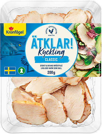 Ätklar kyckling Classic från Kronfågel är färdiglagade kyckling i skivor som passar perfekt för dig som vill njuta av god mat utan krångel. ”Classic” är precis som det låter – en klassiker! Med sin milda smak passar den perfekt för både stora och små smaklökar att servera i salladen, wrapen eller mackan. Alltid svensk kyckling för en godare måltid.