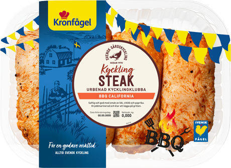KycklingSteak California från Kronfågel är en urbenad kycklingklubba med skinn. Kycklingen är kryddad med en mild hetta från chili och paprika tillsammans med en touch av sötma och lök. Servera gärna tillsammans med grillad majskolv och en solgul läskande mangosalsa för att förgylla varje tugga. Alltid svensk kyckling för en godare måltid