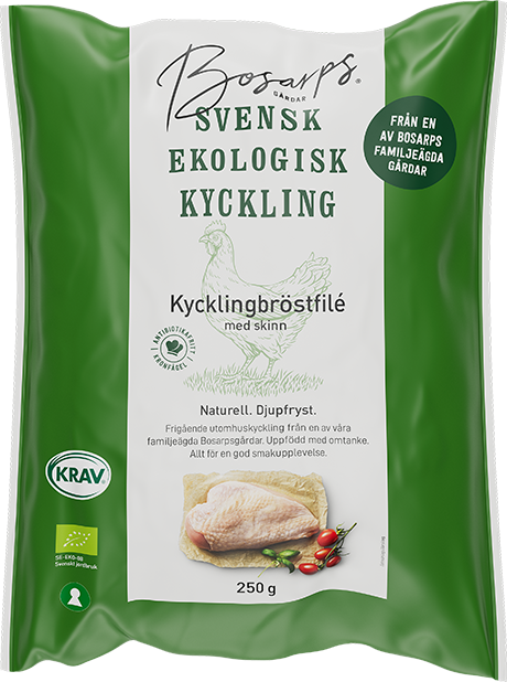 Nu finns Ekologisk kycklingbröstfilé med skinn i frysdisken. Kycklingen är 100% naturell. Kronfågel Bosarpkyckling är en utomhuskyckling från våra svenska, ekologiska gårdar.