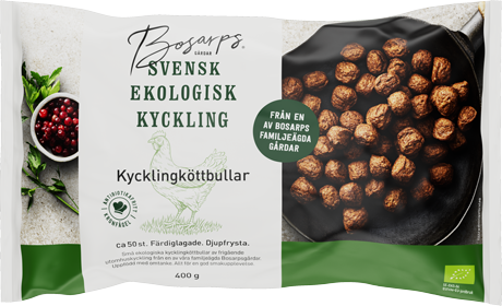 Små frysta ekologiska kycklingköttbullar, gjorda av svensk ekologisk Bosarpkyckling, utan ströbröd eller grädde. Stek eller värm kycklingköttbullarna i ugn direkt från frysen.