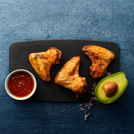 Kycklingvingar 94%, salt, paprika, socker, tomat, kryddor (spiskummin, vitlök, rosmarin, svartpeppar), modifierad potatisstärkelse.