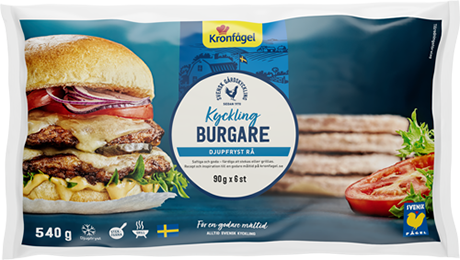 Kycklingburgare från Kronfågel är saftiga, goda och innehåller 90% kycklingkött. En året runt burgare som fungerar lika bra att tillaga i stekpannan eller på grillen. Kycklingburgaren är enkel att variera med goda tillbehör och tillagas direkt från frysen. Alltid svensk kyckling för en godare måltid.
