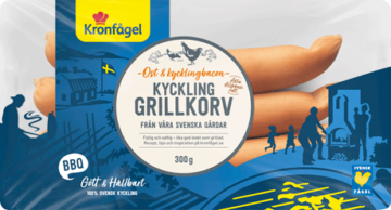 En kryddigare kycklinggrillkorv med härligt knäck, gjord på svensk gårdskyckling. Kronfågels kycklinggrillkorv är rökt med äkta alspån.