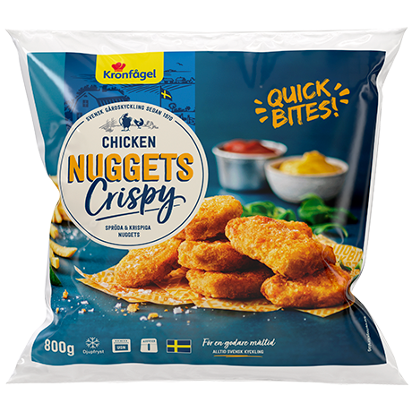 Spröda och underbart goda svenska Kycklingnuggets – en storfavorit hos både vuxna och barn. Det som gör denna Kycklingnugget unik är paneringen som gör att den blir perfekt krispig vid tillagning i alla typer av ugnar. Variera i en Caesarsallad, en wrap eller på en nachotallrik. En riktigt bra kycklingnugget passar med alla tillbehör.