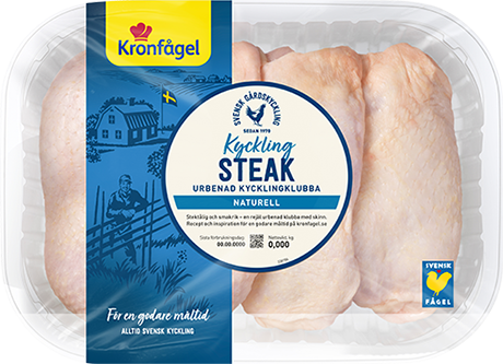KycklingSteak från Kronfågel är en urbenad kycklingklubba med skinnet kvar. KycklingSteak består av svensk kyckling och kan tillagas i stekpanna, ugn eller på grillen. Laga perfekt saftig kyckling i god marinad med ett krispigt skinn. Servera med med en fräsch matig sommarsallad, coleslaw, potatisgratäng eller klyftpotatis. Toppa med goda såser till kyckling såsom tzatsiki och njut.