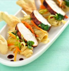 Marinerad kycklingfilé med teriyakinudlar och strimlade primörer