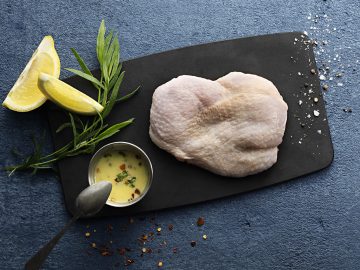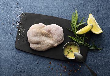 Krispig kycklinglårfilé i varm svampbuljong, svampmajonnäs och dragon