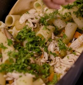 Pasta och tomatsås med hel kyckling och basilikafärskost