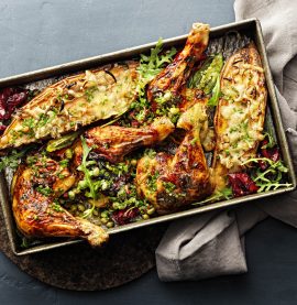 Apelsin- och chipotleglaserade kycklinglår med grillad färsklök
