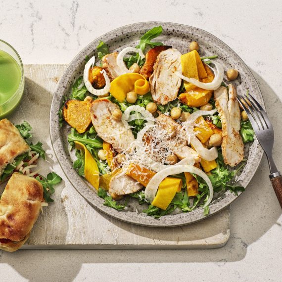 Kycklingsallad med rostad pumpa, kikärtor och soltorkad tomat