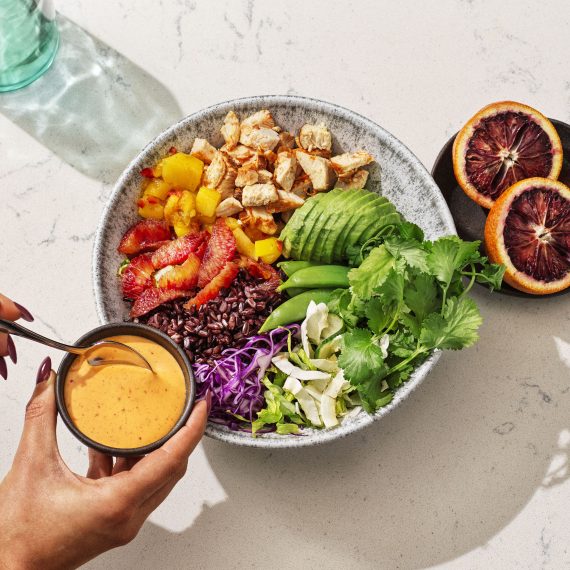 bbq chicken sallad bowl med svart ris, mango, avokado och hot´n´sweet dressing